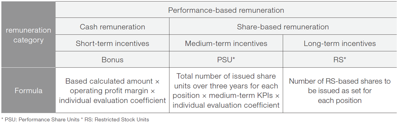 Stock-based remuneration consists of performance share units (hereinafter, PSU) as a medium-term incentive and restricted stock (hereinafter, RS) as a long-term incentive.