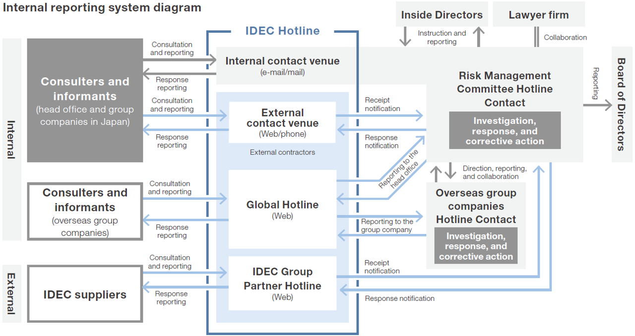 The IDEC Hotline has been established as a contact venue that allows users to select external and internal contact and anonymously or with real names in accordance with the users’ situation. We have established internal reporting and operation rules to protect the confidentiality of consultation and reporting, and to prohibit unfavorable treatment of users. When a report is made, the Hotline Contact established within the Risk Management Committee promptly responds to the report, and works at resolving the problem and preventing recurrence. The report is also promptly communicated to the top management, and regularly reported to the Board of Directors to share risk information. In cases where management may be involved, a system exists to ensure independence and to liaise with an external law firm.