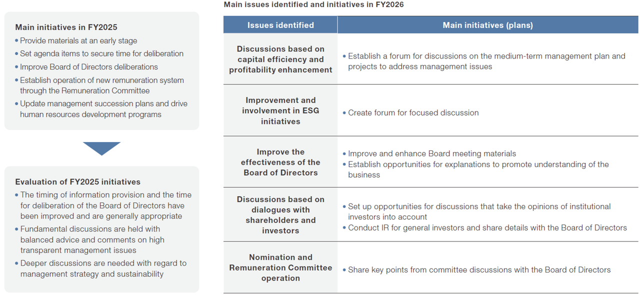 At the same time, evaluations of the Board declined due to insufficient discussions on profitability, capital efficiency, and human resources development in its management plan, resulting in an overall evaluation similar to that of the previous year.