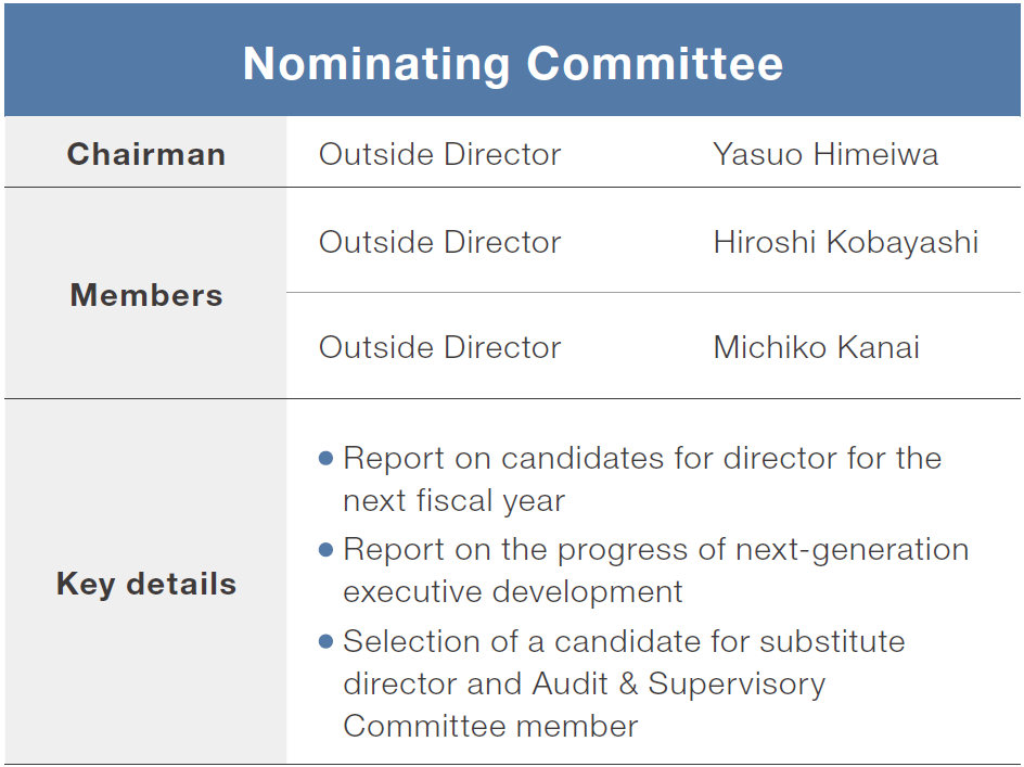 The Company established the Nominating Committee in 2021, and operates that as non-statutory advisory bodies to the Board of Directors. The Nominating Committee considers and deliberates over the nomination of candidates for director, plans to cultivate candidates for the next-generation of top management and succession plans. The members of committee comprise directors selected by the Board of Directors, and the committee has been composed solely of outside directors.