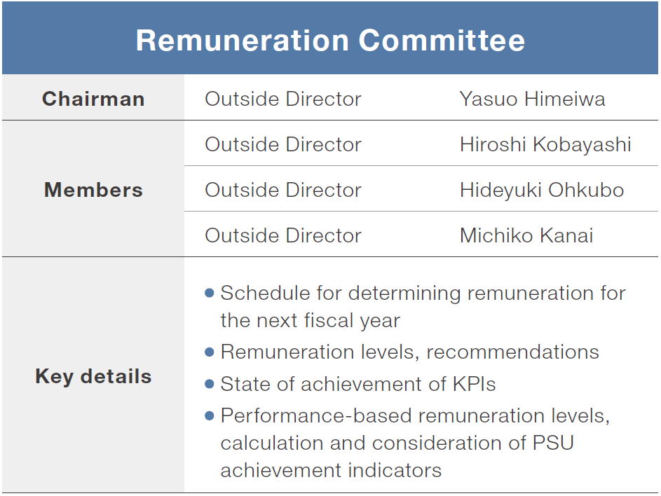 The Company established the Remuneration Committee in 2022. The Remuneration Committee considers and deliberates matters related to the remuneration system and regulations, and makes remuneration decisions in accordance with the system. This committee also reports to the Board of Directors. The members of committee comprise directors selected by the Board of Directors, and the committee has been composed solely of outside directors.