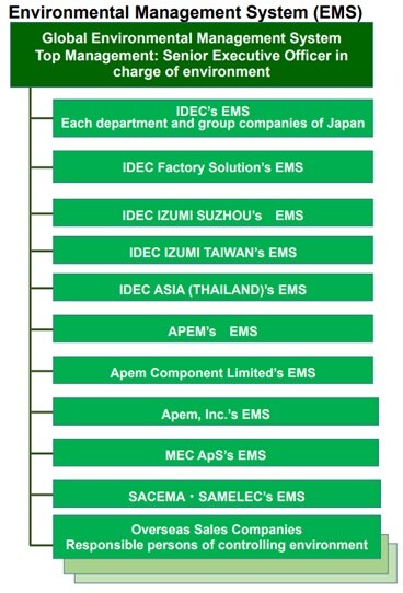 ISO14001Management System Based on ISO14001Since the acquisition of ISO14001 certification of the international standards for environmental management in September 1997, IDEC has been engaged in efforts to contribute to the protection and maintenance of the global environment. Following the revision of ISO14001 in 2015, all the ten group companies in Japan and all overseas eight factories including APEM's head office have acquired certifications as below. Overseas sales companies conduct activities in compliance with the basic contents of ISO14001 based on the global EMS. | |