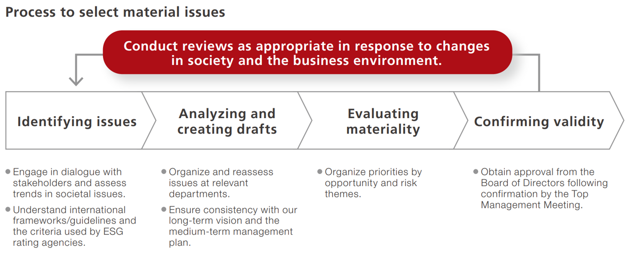 Along with formulating its long-term vision for 2050 and interim vision for 2030 in 2023, IDEC reviewed material issues, incorporating enhancement of its human capital and governance under the heading “business foundation”. IDEC again reviewed some of its material issues in light of the external environment and other factors and, in addition to adding respect for human rights in 2024, also changed its interim vision for 2030.