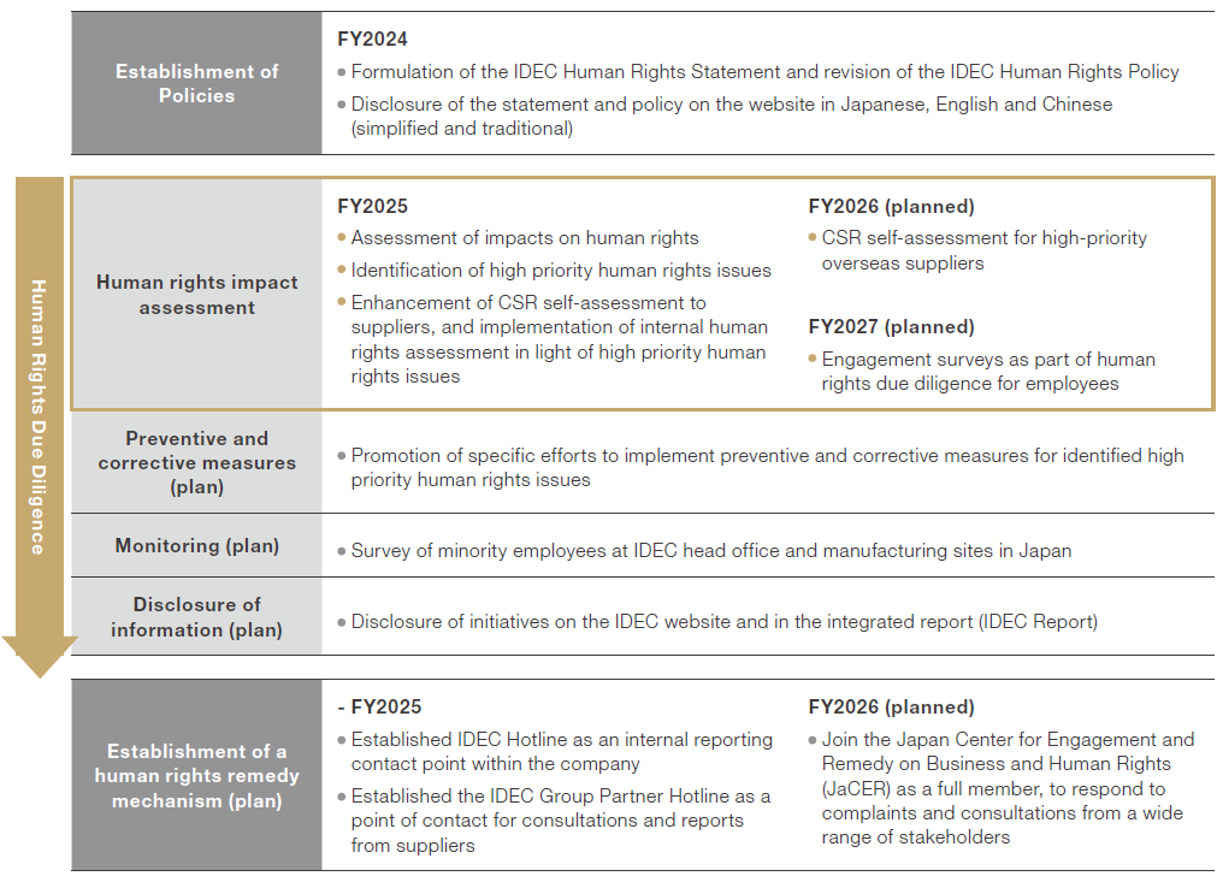The Risk Management Committee’s “Human Rights Subcommittee” has identified and assessed potential negative impacts on human rights within our value chain that could be caused by the IDEC Group’s business decisions and operations. Human rights items below are based on “Human rights items significant to the IDEC Group” in the IDEC Human Rights Statement. Going forward, we will formulate policies that outlines the implementation of preventive and corrective measures to address these high priority human rights issues.